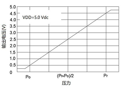 | WYJŚCIE=A×P B uwaga: OUT to analogowe napięcie wyjściowe mierzone w woltach; P to wartość ciśnienia, ciśnienie bezwzględne, w kPa; Zobacz poniższą tabelę dla A i B. |