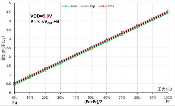 Uwaga: Vout to analogowe napięcie wyjściowe (jednostka: V); P to wartość ciśnienia (w kPa); k. B reprezentuje współczynnik liniowy i przesunięcie, jak pokazano w poniższej tabeli.